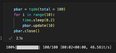 with구문을 사용하여 tqdm을 수동으로 컨트롤한다. update()를 사용하여 수동으로 진행률을 증가 시킬 수 있다.