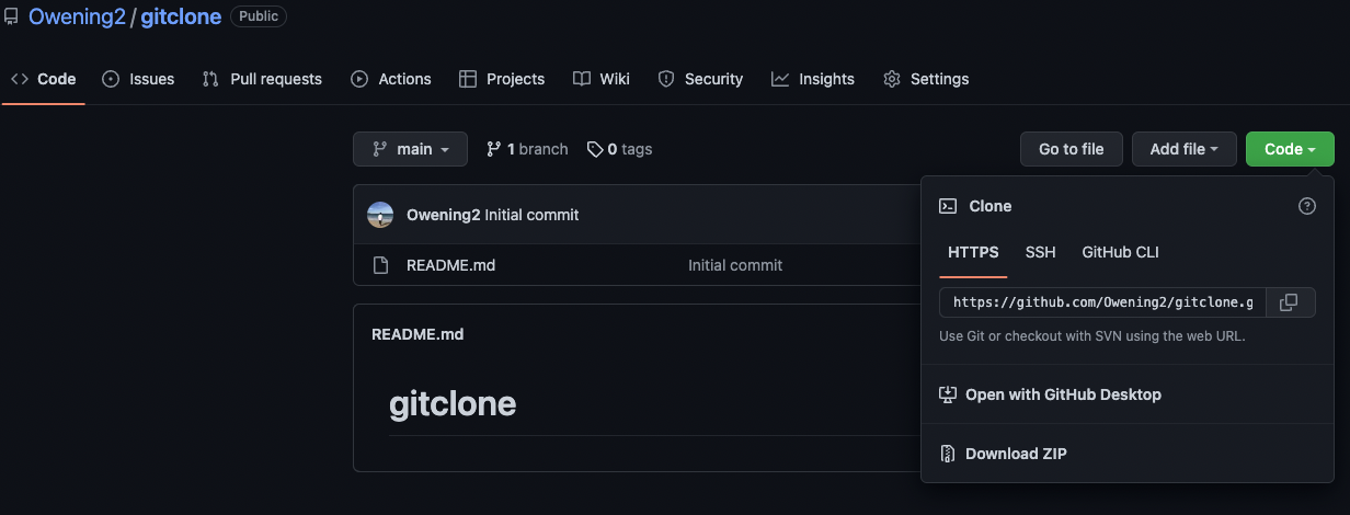 git clone git@github.com:Owening2/gitclone.git퍼블릭 저장소의 별도의 인증없이 클론이 되어야합니다. SSH 키가 제대로 셋업 되어 있지 않다면 문제가 될 수 있습니다.