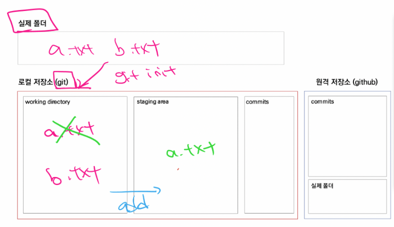 $ git status # WD & SA를 확인하는 명령어!! 정말 정말 중요하기 때문에 습관적으로 사용해야합니다. On branch master No commits yet Untracked files: (use "git add <file>..." to include in what will be committed) a.txt b.txt nothing added to commit but untracked files present (use "git add" to track)ADD