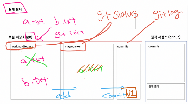 - a.txt는 commit 명령어를 통해 하나의 버전으로 기록됨